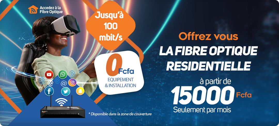 C'est une solution d'accès Internet très Haut débit, qui offre un débit allant jusqu'à 100 Mbit/s, qui permet de répondre aux besoins croissants en débit et en services des particuliers. Afin de faciliter l'accès de la fibre optique à la clientèle résidentielle, Moov Africa Malitel propose une offre fibre optique résidentielle composée d'un accès internet très haut débit asymétrique allant de 10Mb/s à 100 Mb/s.. Vous avez besoin de faire vivre à votre famille une merveilleuse expérience du très haut débit ou d'augmenter votre productivité et votre performance chez vous, choisissez la Fibre de Moov Africa Malitel.