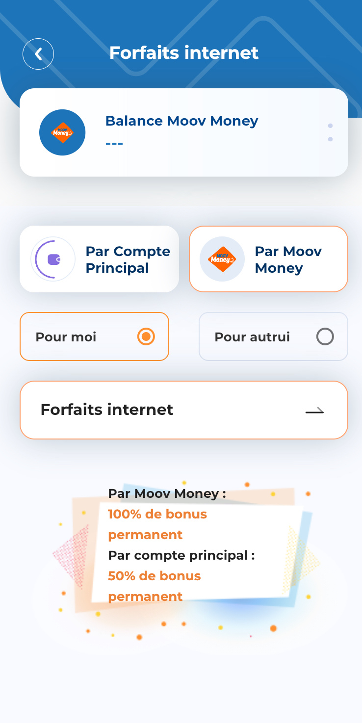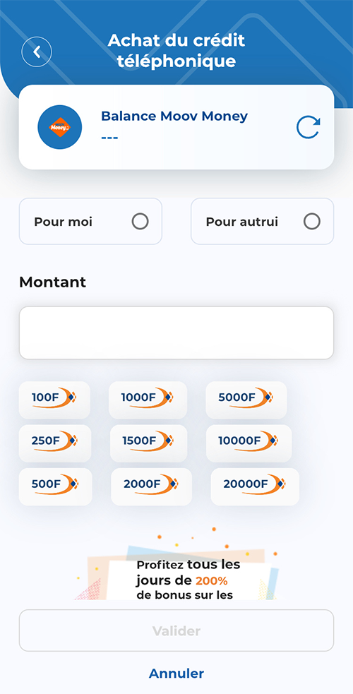 Ce service vous permet d’acheter du crédit téléphonique ou des forfaits internet pour vous et pour votre proche avec Moov Money, en toute sécurité et à tout moment de la journée.