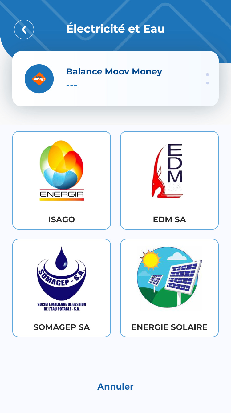 Ce service permet d’acheter les recharges prépayées ISAGO pour les compteurs prépayés d’électricité de l’EDM à travers Moov Money de Moov Africa Malitel.