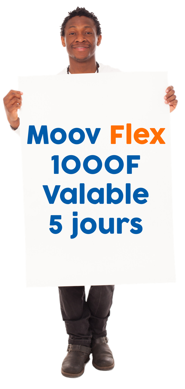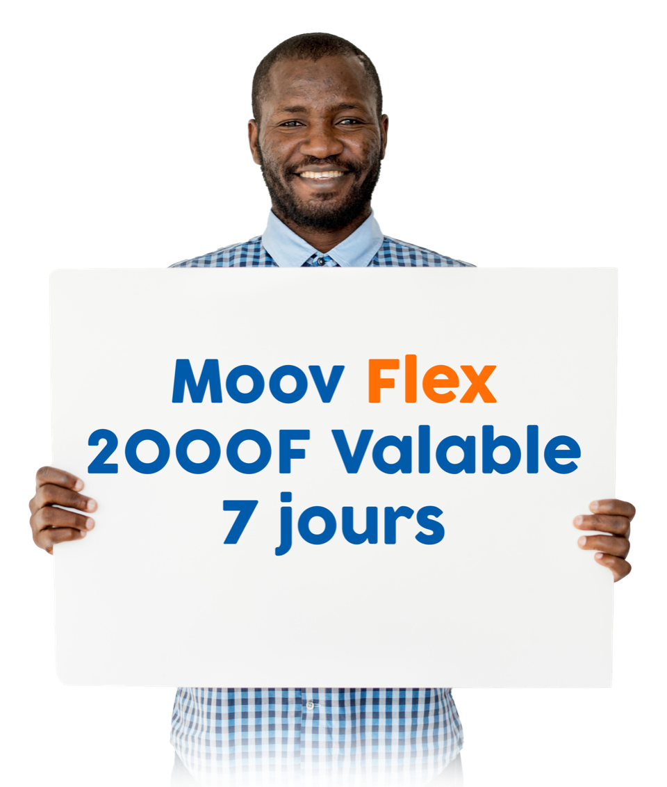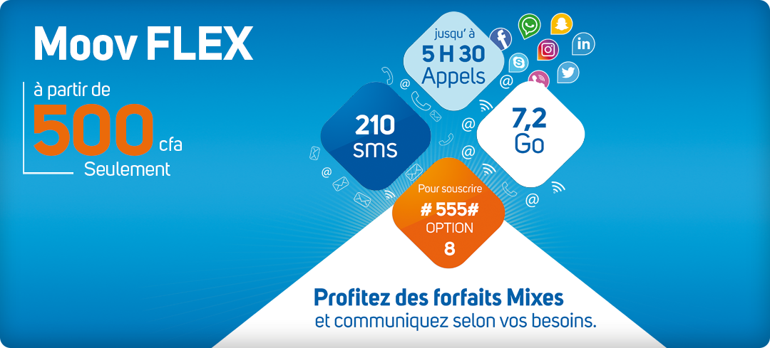 Moov Flex est un ensemble de nouveaux forfaits Mixte (voix, sms et internet) à des tarifs différents et très avantageux et valables vers tous les réseaux nationaux. La souscription se fera selon les besoins de l’abonné.