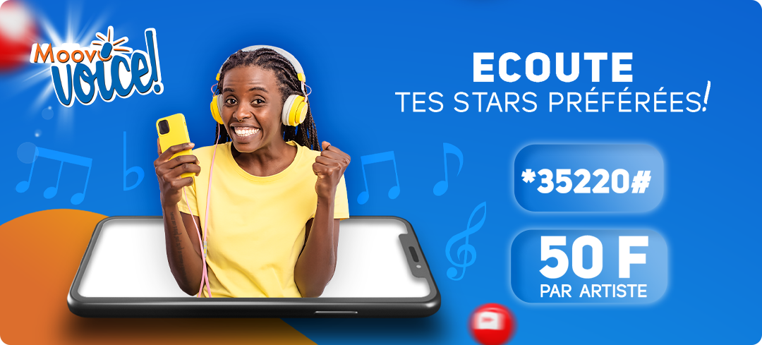 Moov Voice est le nouveau service qui vous permet de suivre l’actualité de vos stars préférées et des grands clubs des championnats européens ! Avec Moov Voice, vous recevez tous les jours les messages vocaux de vos stars ou tout autre sujet qui vous intéresse comme le sport, la religion, la santé, conseils de vie conjugale, la cuisine…